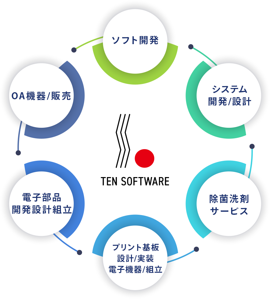テン・ソフトウェアは、ソフトウェア開発から電子機器の設計、製造、OA機器・文房具販売、除菌・洗剤サービスまで幅広い事業を展開しています。ソフトウェア開発事業では、長年培った技術力と経験をもとに多様な業種のシステム化、DX化に貢献しています。電子デバイス事業は、電子部品の開発やプリント基板設計・実装において、高精度なモノづくりを支えています。また、OA機器・文房具販売や除菌洗剤サービスを通じて、オフィスや生活環境の快適化にも貢献しています。確かな技術と誠実な対応を基盤に、テン・ソフトウェアは、時代の変化に柔軟に対応しながら、社会の発展に寄与し続ける企業グループです。