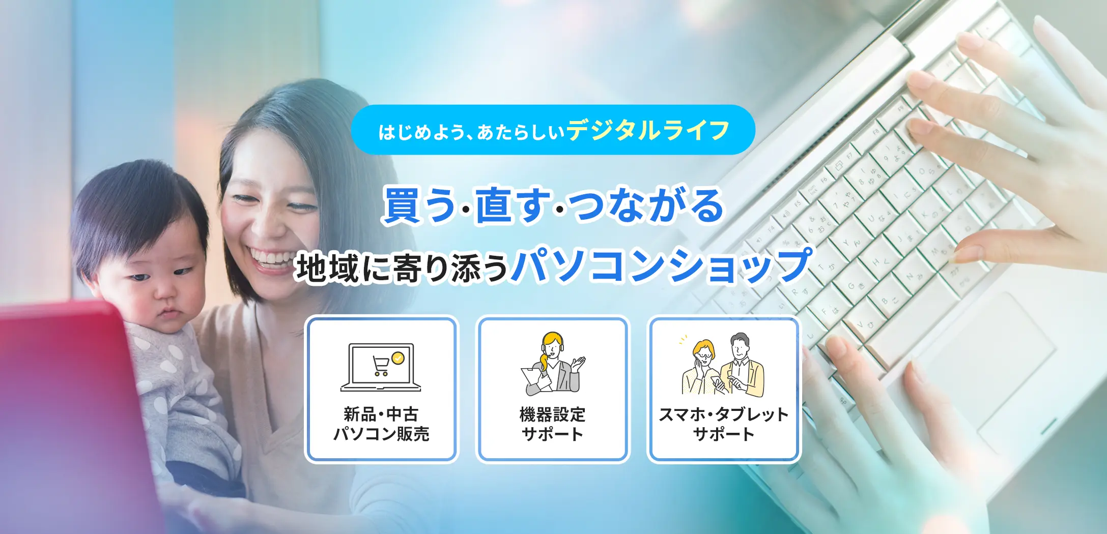 パソコン販売・修理をはじめ、機器設定やスマートフォン・タブレットのサポート、キッティングサービスまで、幅広いお困りごとに対応しています。ご家庭でもビジネスでも、安心してお任せください。